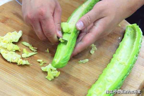 准备一个苦瓜,切去两端根蒂后从中间破开,拿一个小勺子挖掉苦瓜中间的瓤,苦瓜的瓤和籽特别的苦,最好去除干净,减少苦味。