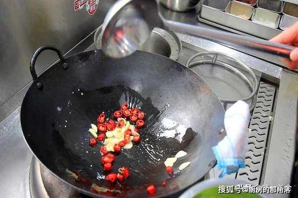 锅内再烧油,倒入蒜片和红线椒翻炒出香味。
