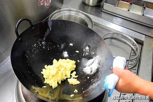 锅内烧油、充分滑锅后倒出热油,倒入凉油 ,热锅凉油能使铁锅具有不粘锅的特性。放入鸡蛋液,用勺子不停地翻炒鸡蛋,使鸡蛋均匀地受热,等到鸡蛋凝固,用勺子打散盛出备用。