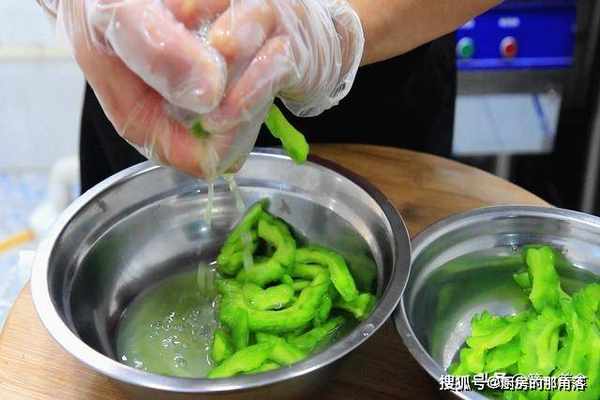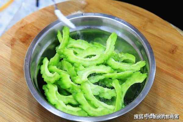 然后把苦瓜斜刀切成薄片放在盆中,再加入一勺食盐抓拌均匀,利用食盐的渗透性使苦瓜快速出水,这样苦瓜就没有那么苦了。