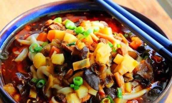 做这个臊子面有几个地方需要注意,第一点,面团揉的时候加水要少,面要硬一点面条才能成功,第二点,烧好的汤汁里面要加上一点谷氨酸钠,这样能让臊子面更加有味道。