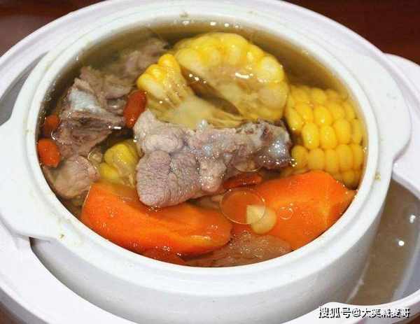 3、砂锅内放入捞出来的排骨,倒适量水,一次就倒够,中途不要加水,再放入生姜,炖排骨料,料酒,适量的盐,和玉米,大火烧开,转小火慢炖1小时