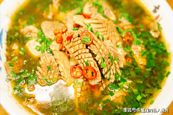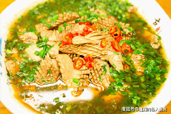 接着把韭菜花倒进去,大火滚起来,韭菜一变色立马起锅,浇在腰花上面,撒上小米椒圈,激上200度的热油,美味即成。
