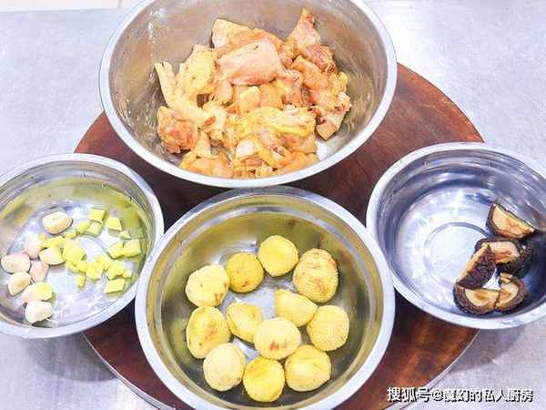 半只麻公鸡剁成均匀小块,加入食盐2克、白糖少许、胡椒粉2克、生抽10克、少许料酒抓拌均匀,再加入一小撮淀粉继续拌匀,然后腌制10分钟;200克去皮的板栗;几个泡发的香菇,香菇去除硬根后对半切开;大蒜切成蒜粒;生姜也切成小粒备用。