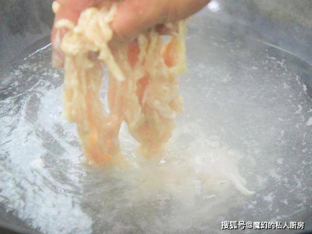 起锅烧水,水开以后倒入鸡丝,快速在热水中焯烫至定型后,捞出控油备用。