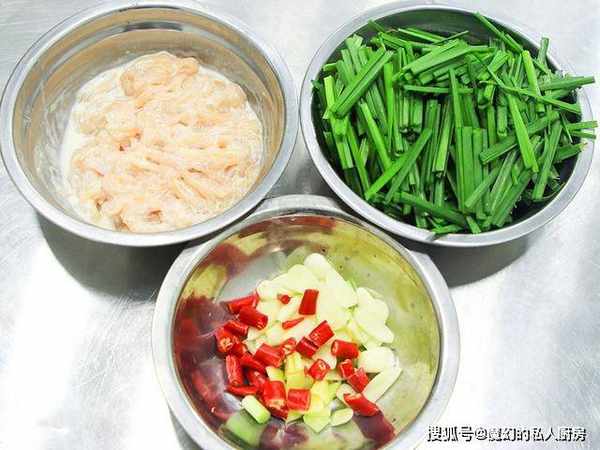 一把清洗干净的韭菜切成韭菜段;两根葱白切成葱段;一块生姜切成姜片;大蒜切成蒜片;小米椒切成辣椒圈;一块鸡胸肉切成细丝,加入一个鸡蛋清、食盐2克、料酒5克、玉米淀粉50克用筷子搅拌均匀备用。