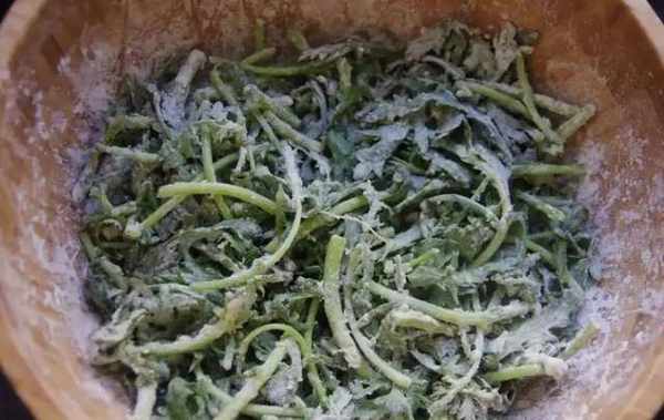 然后倒入适量的面粉,边倒边搅拌,直到每一片菊花都沾上一层薄薄的面粉,可厚可薄。