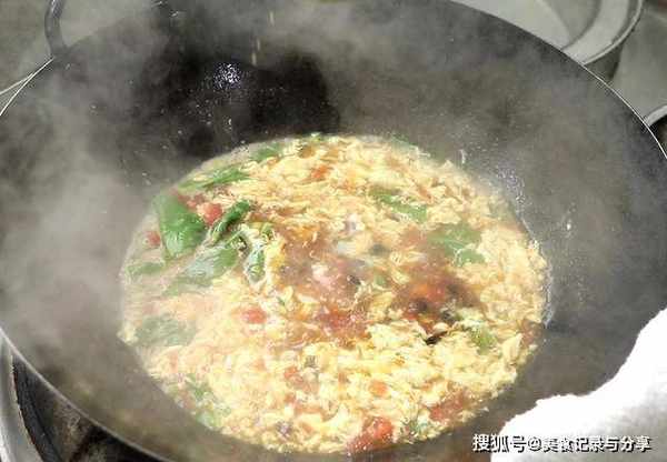 3.锅内烧油、油烧热以后倒入番茄丁,加入少许食盐便于番茄快速出汁,多翻炒一会充分炒出番茄的红汁,倒入葱花和木耳继续翻炒出香味,从锅边淋入适量清水,开始调味:加入鸡粉1克,胡椒粉1克,陈醋10克,生抽10克搅拌均匀,开大火把汤汁烧开。
