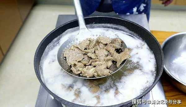 锅内烧水,水烧开以后关火,把牛肉一片一片放入锅中,牛肉下完以后再开火,大约煮18秒钟即可,煮至牛肉没有血沫、全部飘起来即可。