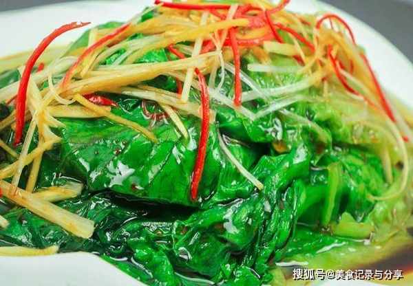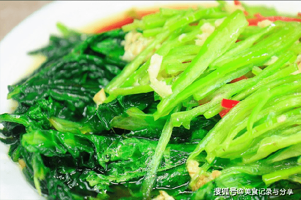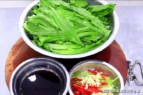 然后把控干水分的油麦菜摆放在盘中,浇上调好的料汁,放上青红椒丝和蒜末等待激油。锅内烧油,油温七成热、油面冒青烟时起锅,把热油浇在蒜末上面激发出蒜香味、美味即成。