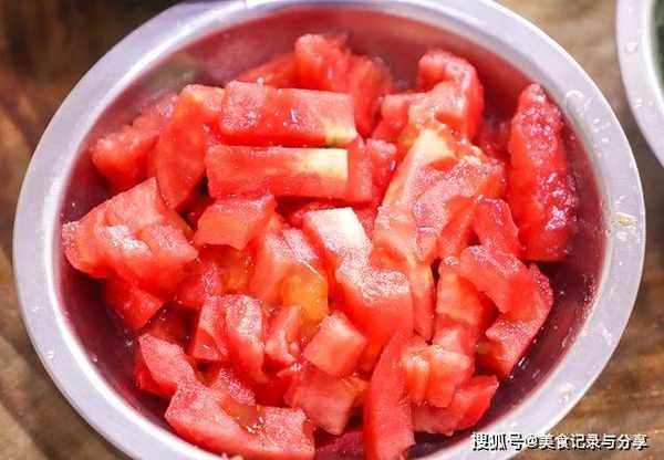 1.首先,准备番茄一个,放在开水里面烫一下,破皮以后剥掉番茄的红衣,切成番茄丁。