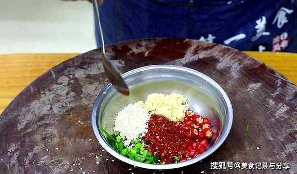 切点蒜末、小米椒圈、小葱圈放在一起,加入一勺粗辣椒面,一勺熟芝麻,浇上热油激发出香辣味,再加入适量的辣椒红油和芝麻香油,两勺生抽,一勺蚝油,少许食盐和鸡粉,搅拌均匀即可。