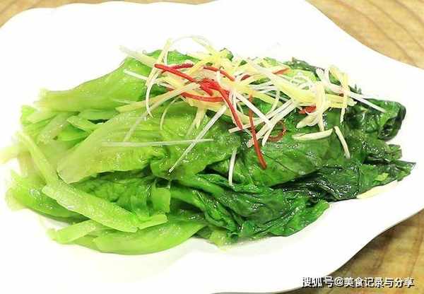 3.锅内烧水,加入食盐2克,鸡粉1克,淋入少许植物油锁住水分防止生菜变色,水烧开以后倒入生菜,快速焯烫20秒钟,生菜塌架后立即捞出用凉开水冲凉,快速冲凉能保持脆嫩的口感,把控过水的生菜颈部朝同一方向摆放在盘中,再撒上配菜丝。