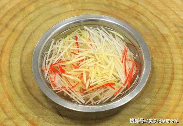 2.切点葱丝、姜丝、小米椒丝、蒜丝,放在一起全部用清水泡上,去一下辛辣味同时防止水分流失、萎缩。
