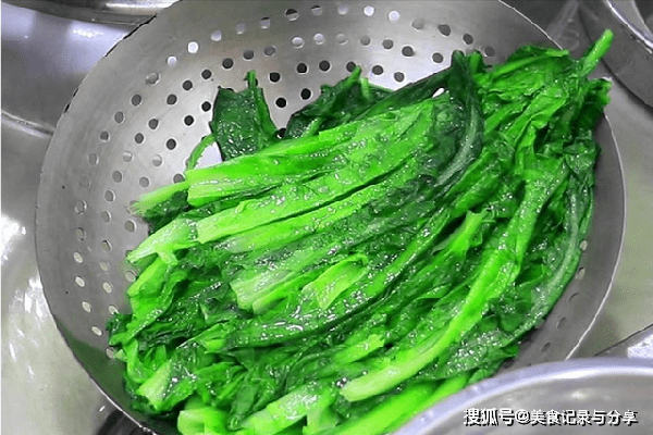 大约焯水30秒钟,油麦菜烫软、返青以后倒出来。