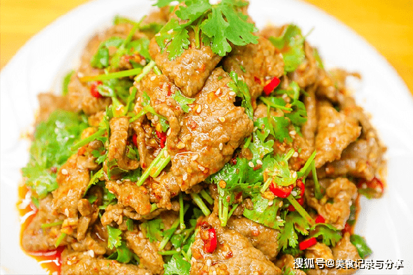 把料汁均匀淋在牛肉片上,倒入香菜段翻拌均匀即可,一道鲜嫩滑口的凉拌牛肉就做好了。