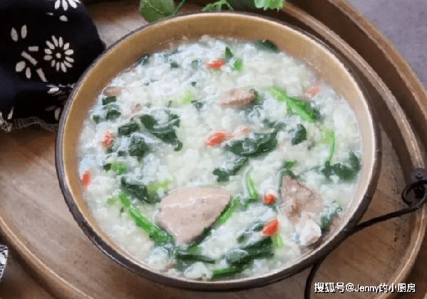 最后倒入菠菜、枸杞煮两分钟,再加盐、胡椒粉、香油调味,这道粥就做好了,营养又美味。