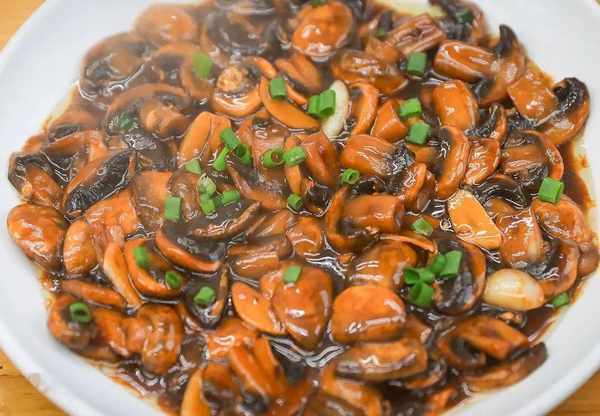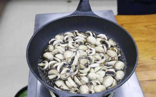 4.沿锅边淋入一点清水,方便味道更好地渗入到口蘑里面,芶入少许水淀粉,把汤汁收浓就可以出锅了,美味即成。