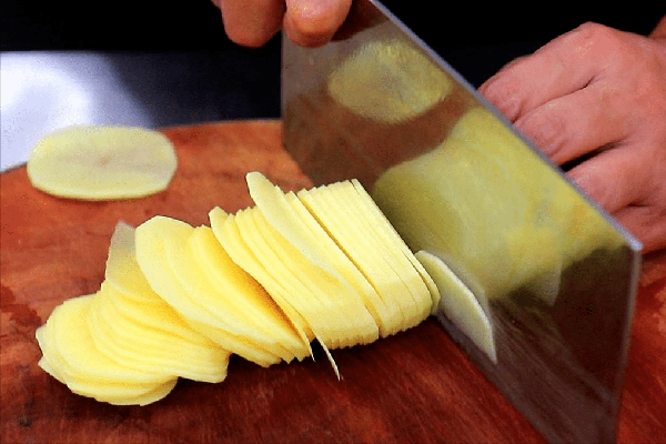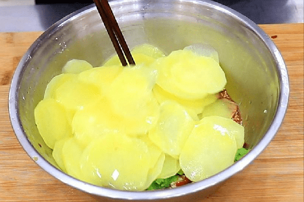 1.准备土豆两个,清洗干净削去外皮,切成均匀的薄片。切好以后,放入锅中煮一下,变色后捞出,晾凉备用。