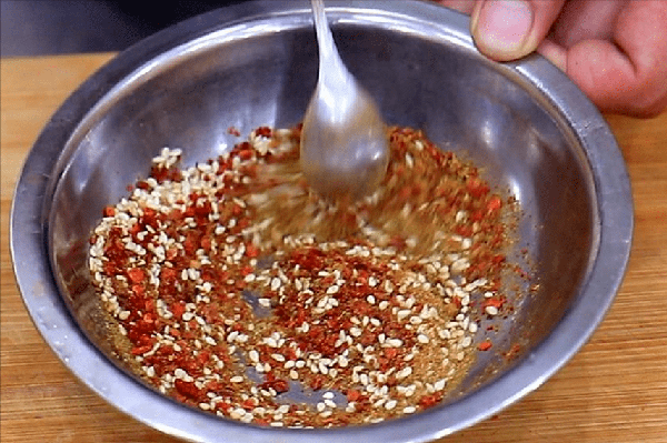 准备一个小碗,放入适量的辣椒面、孜然粉、花椒粉,再放入一些白芝麻,搅拌均匀备用。