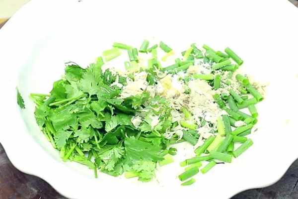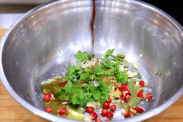 2.准备米椒几根,切成圈。准备大蒜几粒,拍扁切成末。准备香菜几根,切成段。一起放入盆中,加入适量的食盐、鸡粉、白糖,再倒入一些芝麻香油、花椒油和蒸鱼豉油。