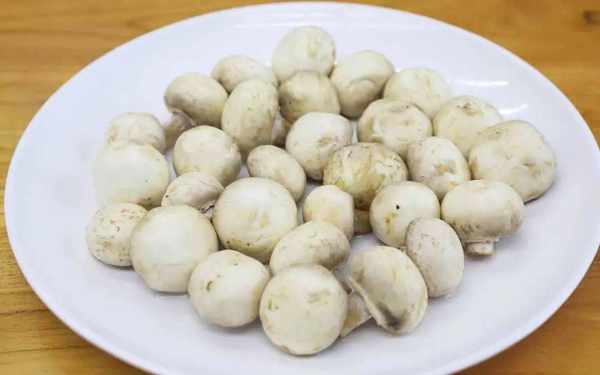 1.准备适量的口蘑放入盆中,加入一勺食盐,一勺小苏打,用清水浸泡10分钟,用淡盐水浸泡既能抑菌,还能充分去除杂质,泡好以后用清水反复冲洗干净,切成片备用。