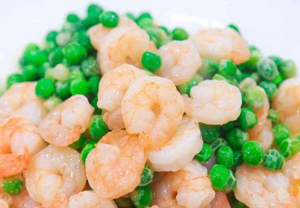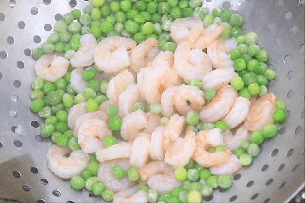 3.锅内烧水,水烧开以后放入豌豆,淋入一点植物油锁住里面的营养,汆煮1分钟左右,豌豆断生以后放入虾仁继续煮20秒钟,虾仁变红以后倒出来用清水冲洗干净,控水备用。虾仁不能久煮鲜味容易流失,吃着不够嫩。