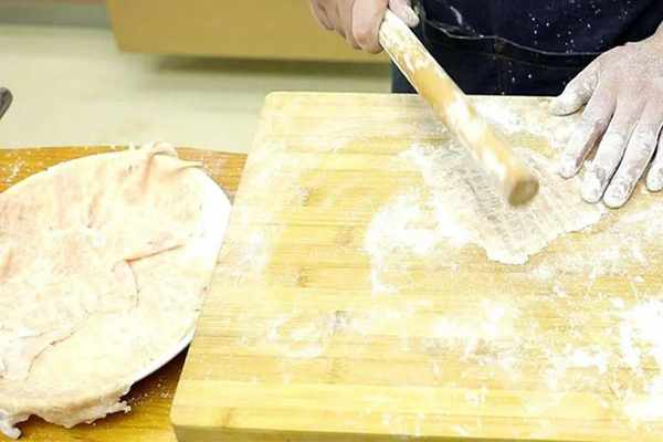 1.把里脊肉切成稍微厚一点的大肉片,切好以后在肉片两面均匀裹满淀粉,用擀面杖反复敲打,把肉片打薄、打成半透明状,依次把所有的肉片都敲成薄片,放在盘中备用。