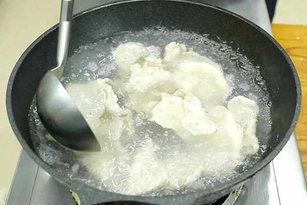 3.烧半锅开水,把肉片依次放进去,不要一块全倒进去容易粘连,肉片非常薄,千万注意不能煮老了,基本上水一开肉片浮起来就熟了,前后也就30秒钟左右的时间。