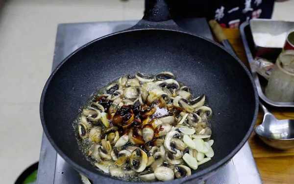3.锅内烧油,放入蒜片爆香,这道菜主要吃个鲜味,葱姜太压味不要放,把口蘑倒入锅中,开大火爆炒,加入蚝油,老抽上色,生抽,味精,继续大火爆出香味。