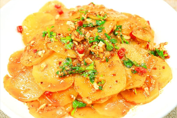 3.起锅烧油,油烧至七成热,大量冒青烟时,把热油浇在辣椒碗中搅拌均匀,把辣椒油倒入小米椒、蒜末盆中,再倒入土豆片,颠盆拌匀后即可装盘上桌。