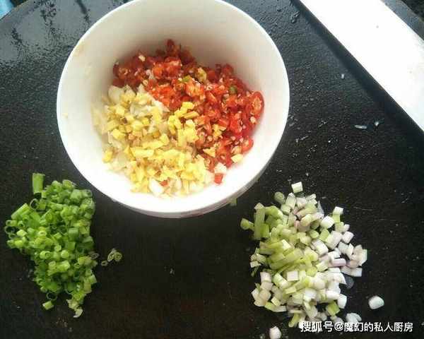 3、开始准备调料,把大蒜、生姜、小米椒、小葱,全部切成碎末,装入碗中备用,姜不用去皮,带着皮的老姜更好。