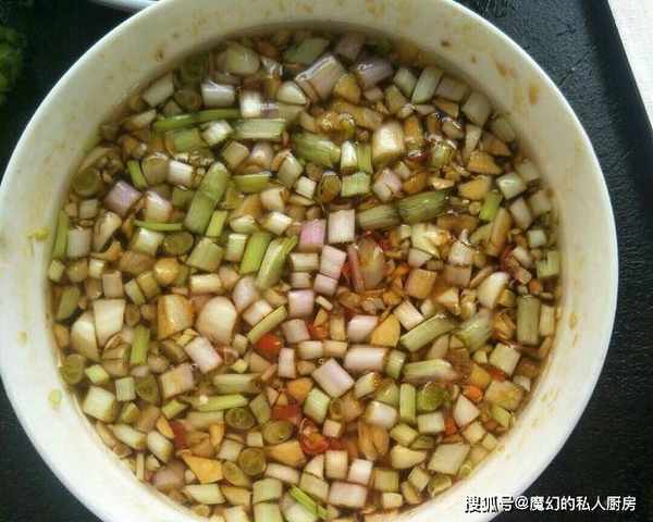 6、起锅烧油,油热以后,分批浇入碗中,激发出调料的香味,搅拌均匀。