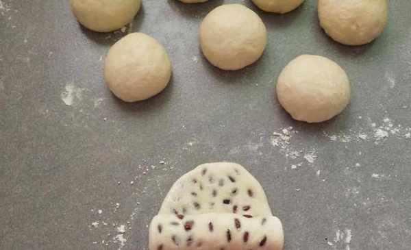 第二步:发酵好的面团揉出空气,揉成长条,分成等份的面条,擀成薄圆片,加入一勺蜂蜜红豆沙,像包子一样把嘴巴压紧,然后用擀面杖擀成牛舌状。