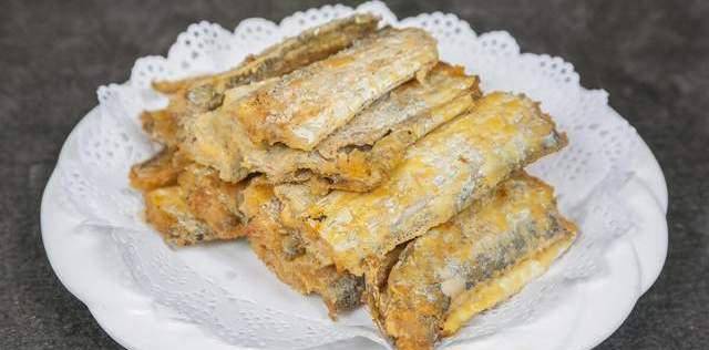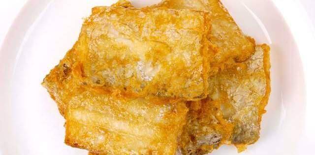 6.锅中倒入少许煎炸油。加热后,将裹好面粉和淀粉的毛尾放入,中小火慢慢煎至毛尾呈金黄色,即可从控油盘中取出食用。