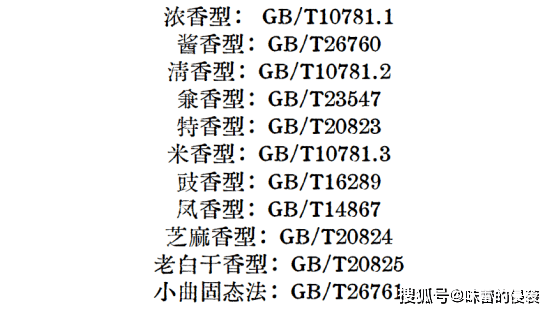 浓香型: GB/T10781.1、酱香型:GB/T26760、清香型:GB/T10781.2