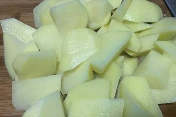 4、土豆去皮切滚刀块状,放水里浸泡。