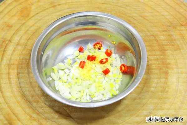 一道好菜,精彩的搭配也是必不可少的。准备小葱几根,切成葱花剁碎,方便下锅后更容易提味。大葱白一段,破开后切成葱花,加生姜一块,切成姜末,小米椒一个,切成圈备用也是曾味调色的佳品。