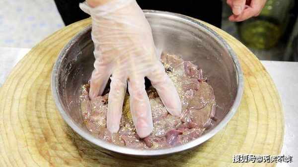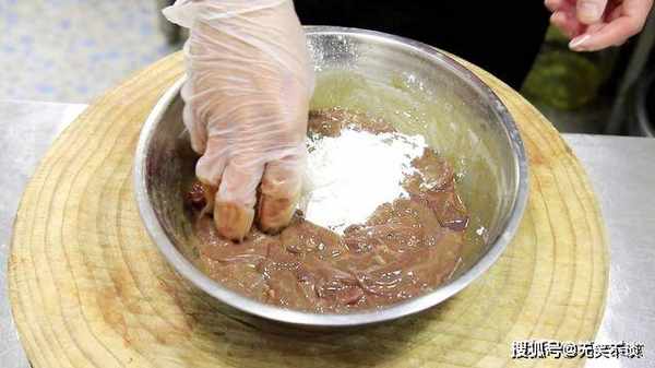 完成上述工序之后,我们就要把猪肝上浆了。这一步也很简单,加入淀粉20克左右,用手拌匀即可。这样让猪肝表面裹上一层薄薄的淀粉,既可以锁住猪肝中的水分,防止猪肝出锅后干硬苦涩,也可以在腌制的过程中,让猪肝更入味。腌制时间不用很长,10分钟即可。这样的猪肝做出来以后,味道浓郁的情况下,也会更滑更加鲜嫩。