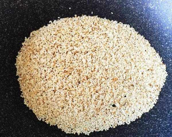 1、锅烧热,倒入准备好的白芝麻,用小火持续搅拌约5分钟,至芝麻变黄,搅拌至香味散出,捞出自然冷却待用。