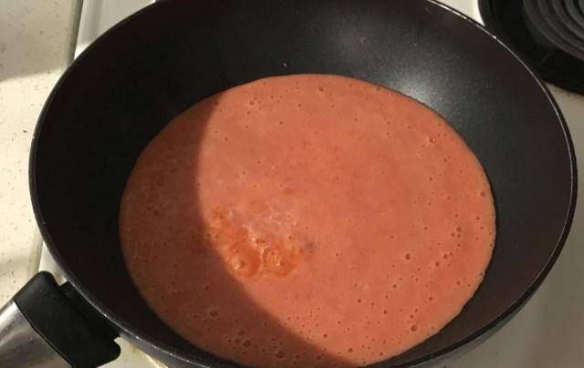 第二步:将番茄泥倒入锅中,加入适量的冰糖,开大火烧开。烧开后继续煮,不断搅拌。慢慢地你会发现番茄汁变少了,变得很粘稠。这时候我们调到最低火继续搅拌5分钟左右。