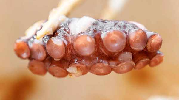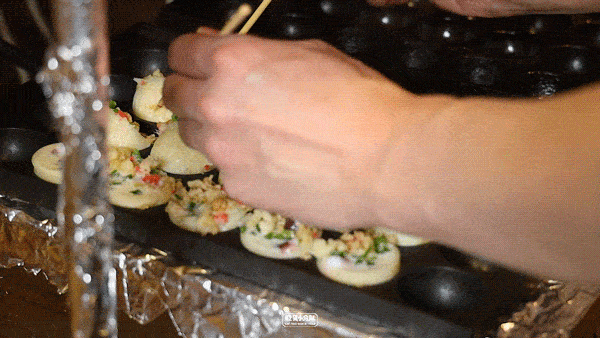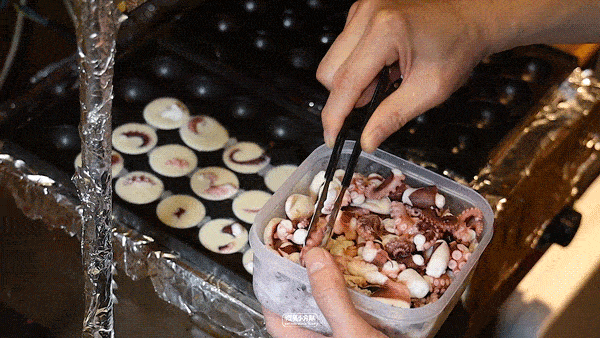 盒子打开,都是提前制熟的章鱼段,看得出相当饱满肥美,一颗颗依次填入,与半凝固的面糊相融合。真材实料,没骗人,是绝对能吃到章鱼的章鱼小丸子。