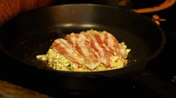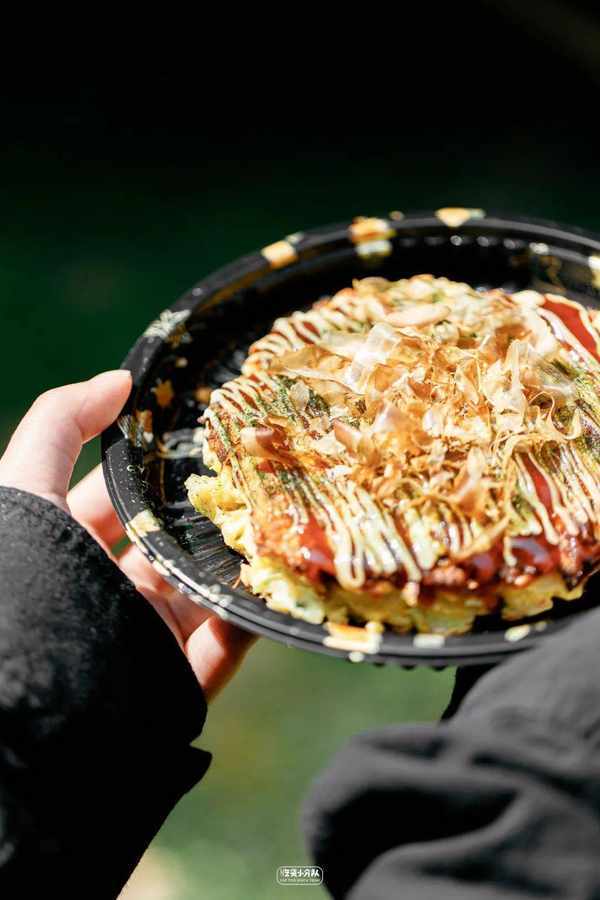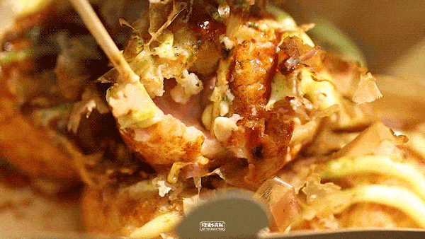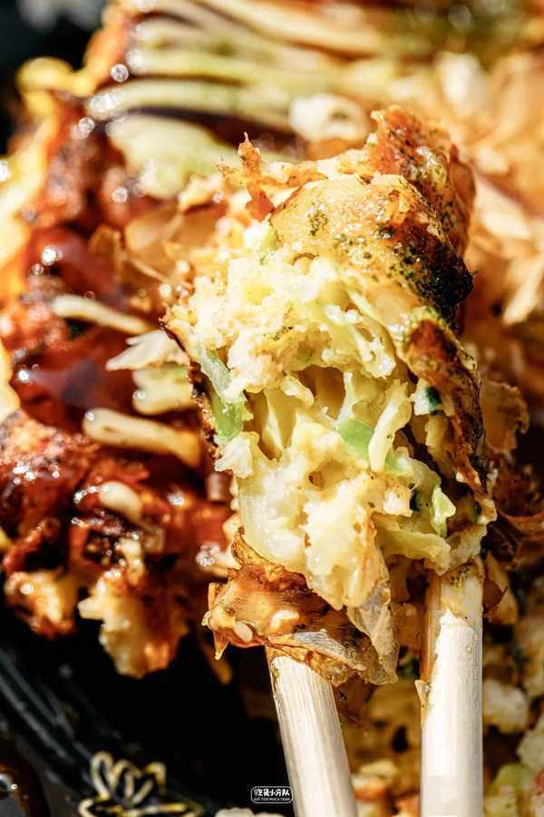顶部铺了香香脆脆的煎猪肉片,肥瘦相间,增添油香风味和口感层次。包菜和鸡蛋的组合,柔软中包含脆爽,搭配咸甜酱料实在是一绝,完全还原了大阪街头的风味。