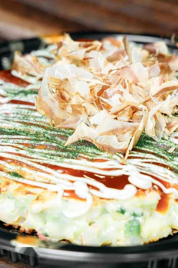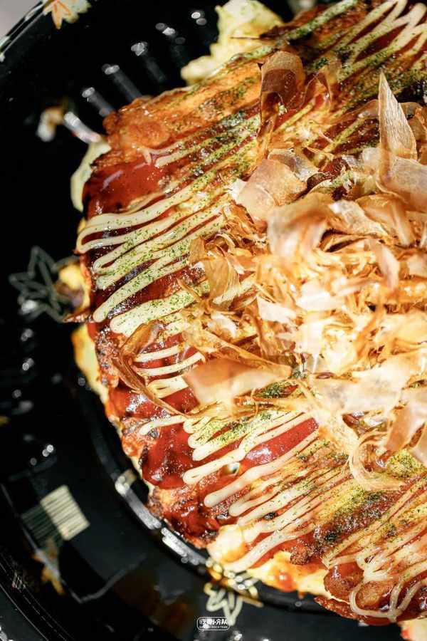 大阪烧也是小店的主力军,也有“日式披萨”、“日式蚵仔煎”的别称。其实和章鱼小丸子异曲同工,都是面糊+馅料的组合,可以说是,是厚版的蔬菜煎饼。
