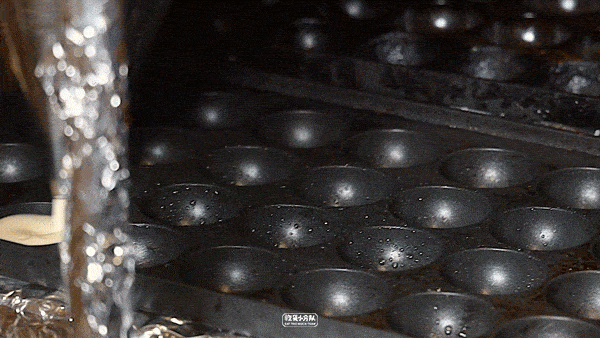 在圆形模具中,挤入面糊是第一步。整个过程丝滑流畅,需等待高温使它慢慢凝固成型,成为一只面糊小碗,才好装进更多的馅料。