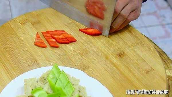 青椒红椒各半个,去籽后都切成菱形片,和面筋放在一起。