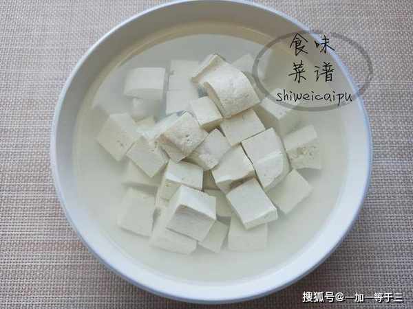 1、准备一块300克重的老豆腐,切成小块,装入碗中,加入半勺盐,浸泡十分钟,去掉一部分豆腥味。