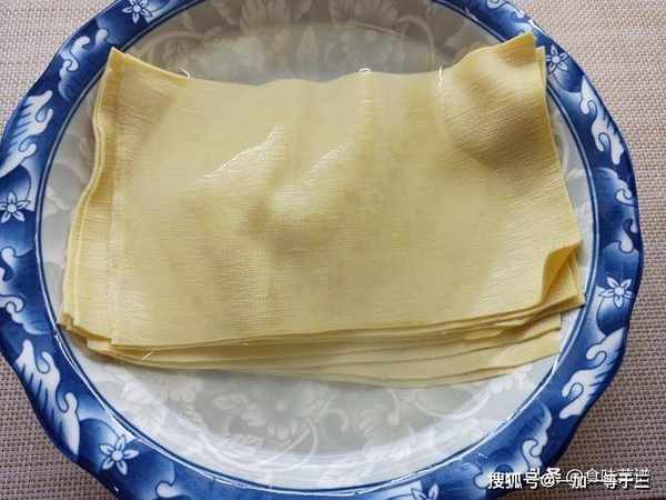 2、把豆腐装入盘中,锅内烧开水,把豆腐皮放入蒸锅中,大火蒸上两分钟,时间到取出豆腐皮,浸泡在凉开水中。