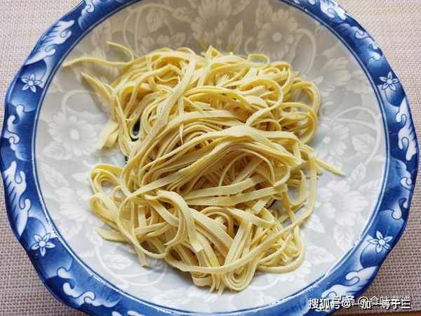 3、约5分钟后,捞出豆腐皮,挤出多余的水分,切成细丝装盘备用,蒸而不是焯水,可以保留原滋原味,营养不流失,口感也更劲道。