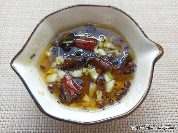 5、准备用的料汁,大蒜拍扁装入碗中,放入半勺食盐(2克),味精(1克),醋(3克)芝麻香油(5克),搅拌开来,浇上更离火的热油,我放了辣椒和花椒,这样更入味,不喜欢的可以不放。